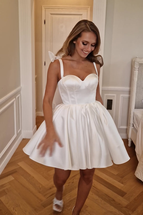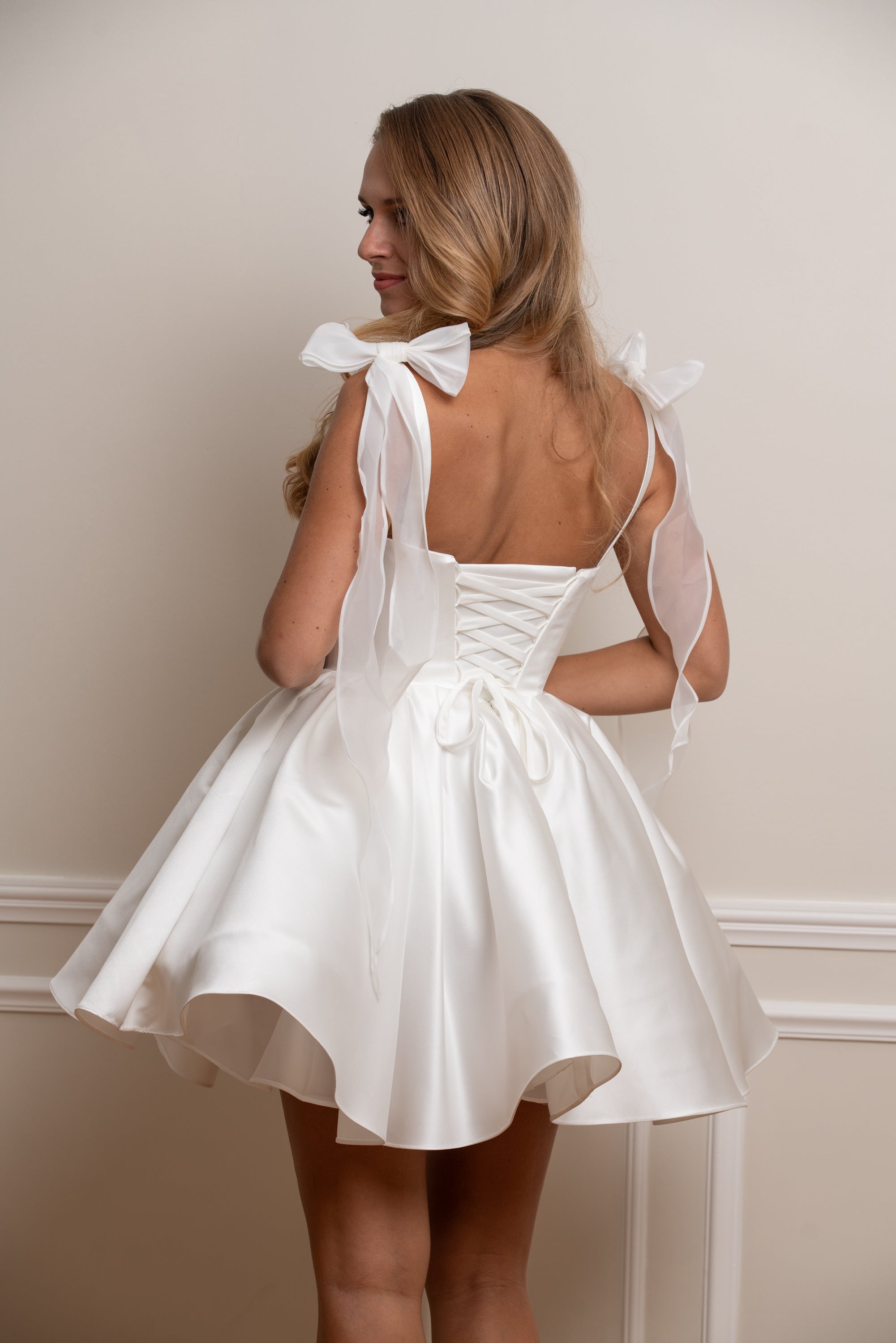 Cette robe de mariée courte en satin ivoire séduit par sa coupe moderne et son allure féminine. Le corset bustier, parfaitement structuré, met en valeur le buste avec délicatesse, tandis que la jupe évasée aux plis généreux offre un volume aérien et une fluidité idéale pour danser et se mouvoir librement.