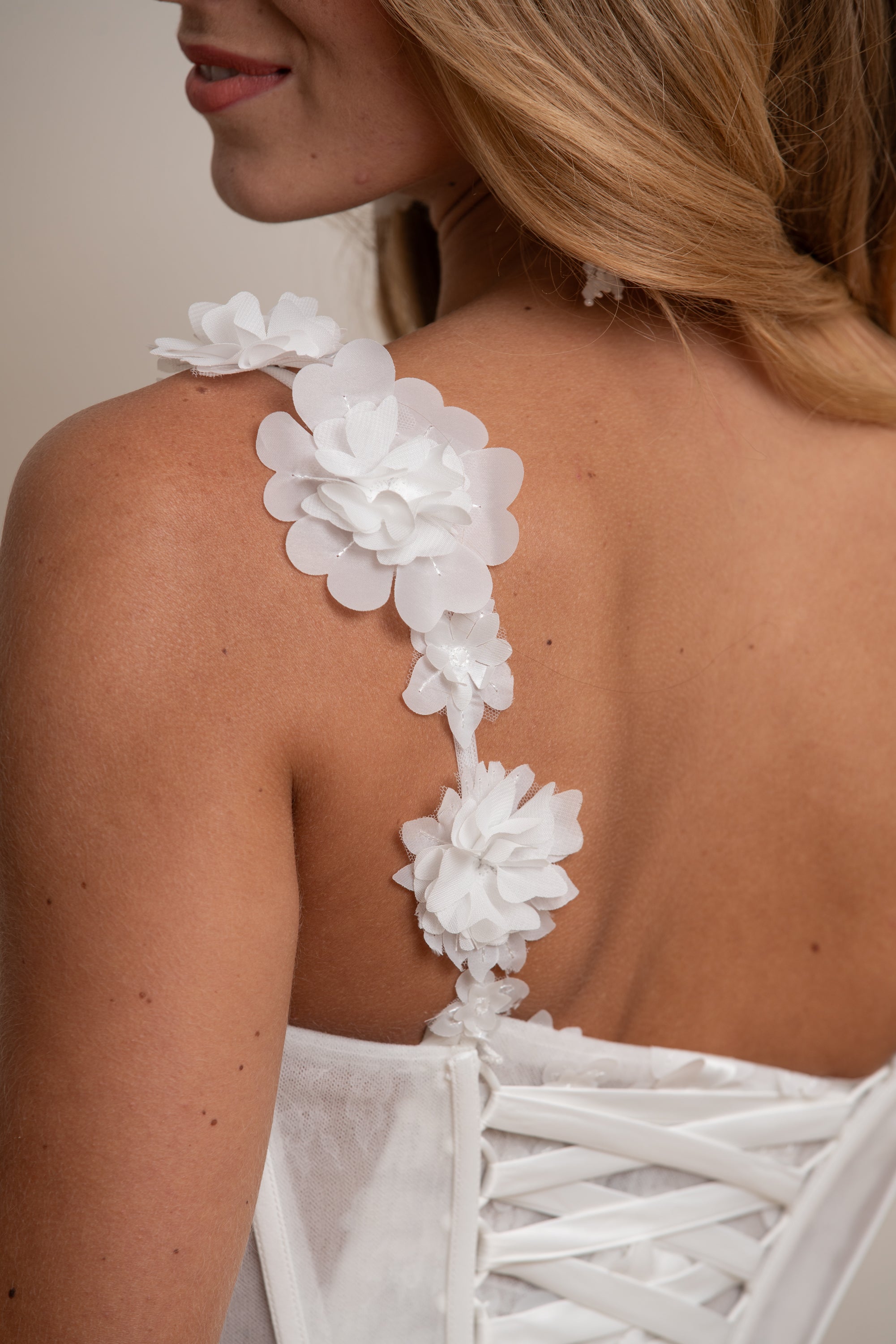 Le décolleté carré orné de bretelles fleuries souligne la féminité avec élégance, offrant un look à la fois chic et romantique. Parfaite pour une mariée moderne, cette robe de mariée originale allie confort, raffinement et tendance.