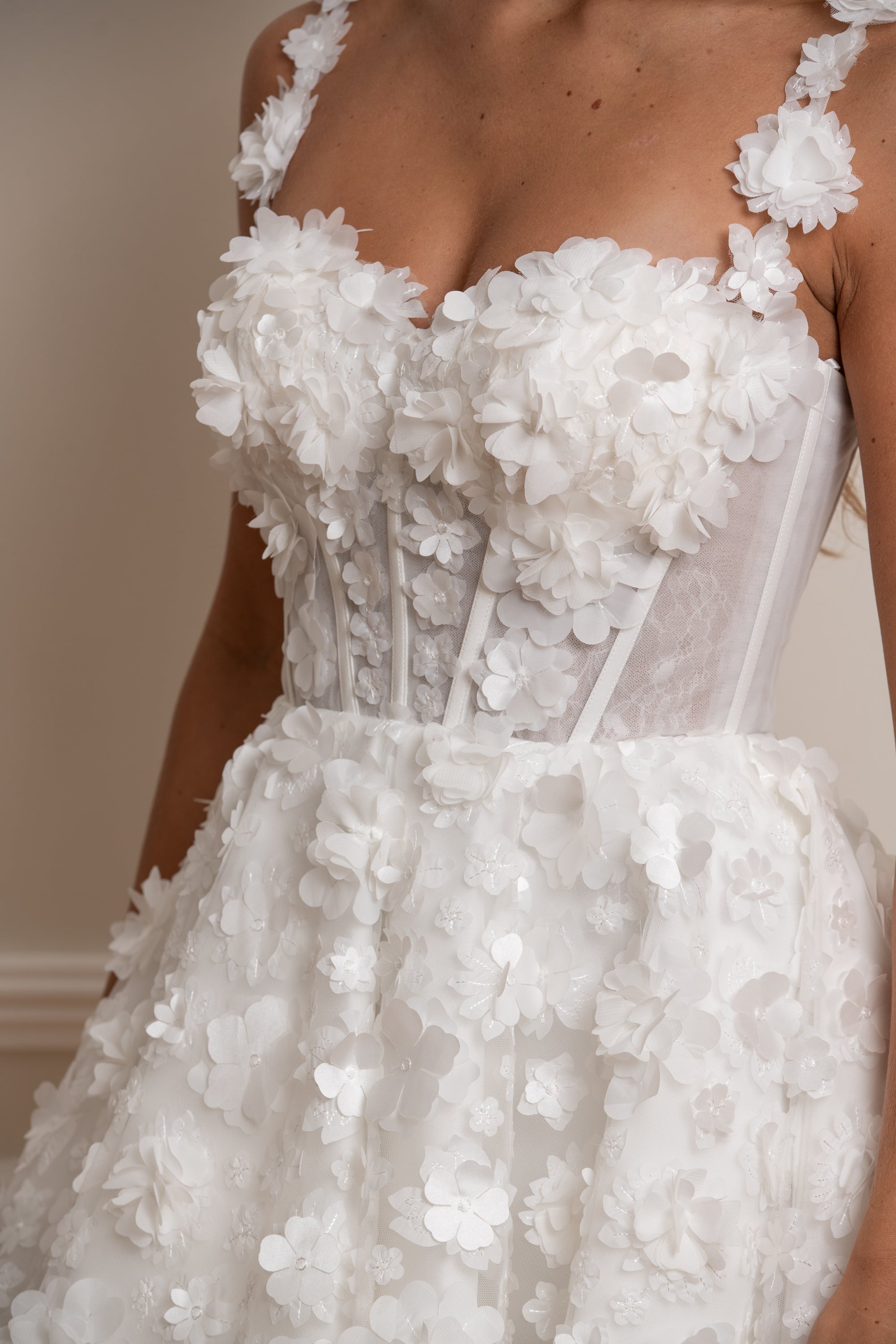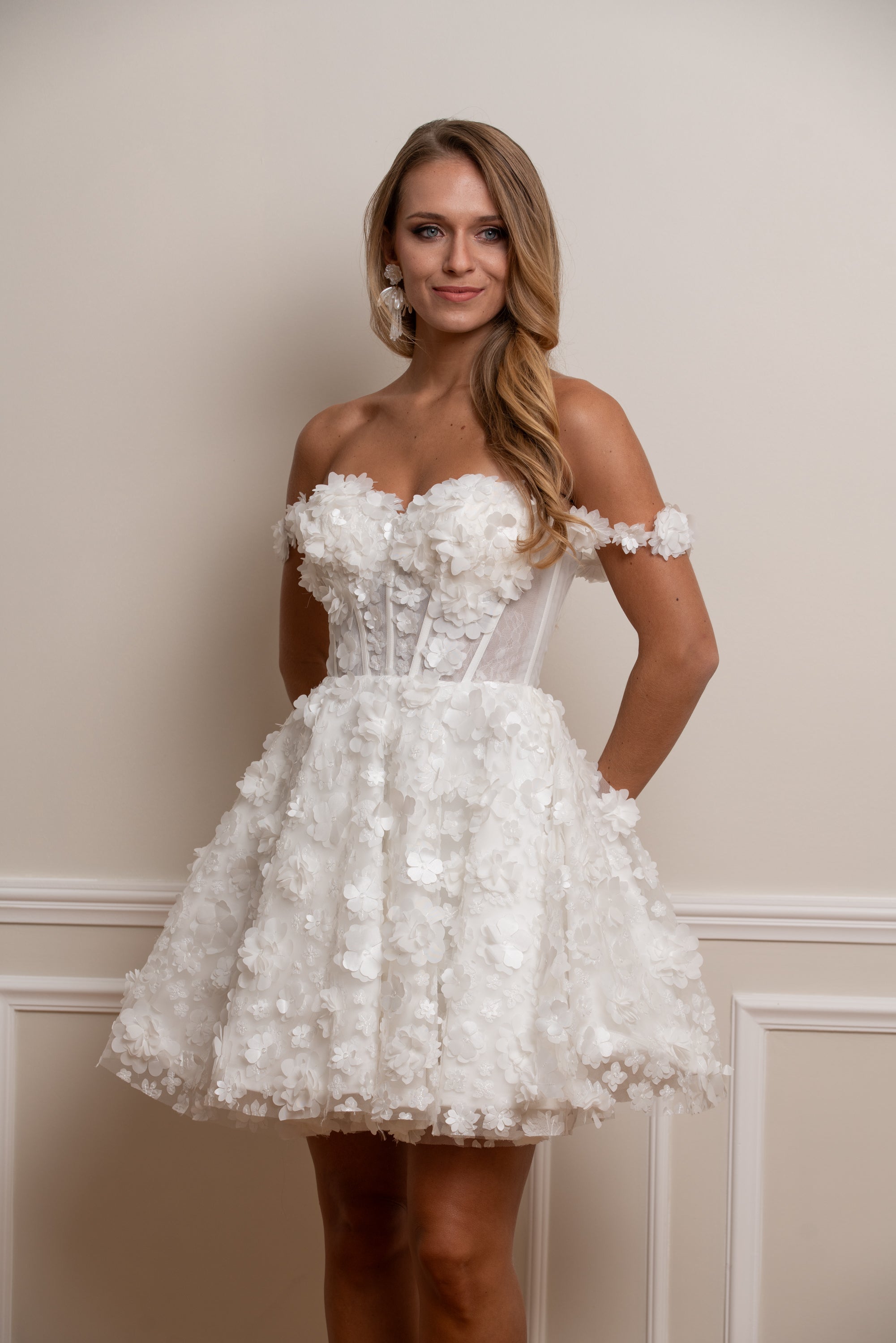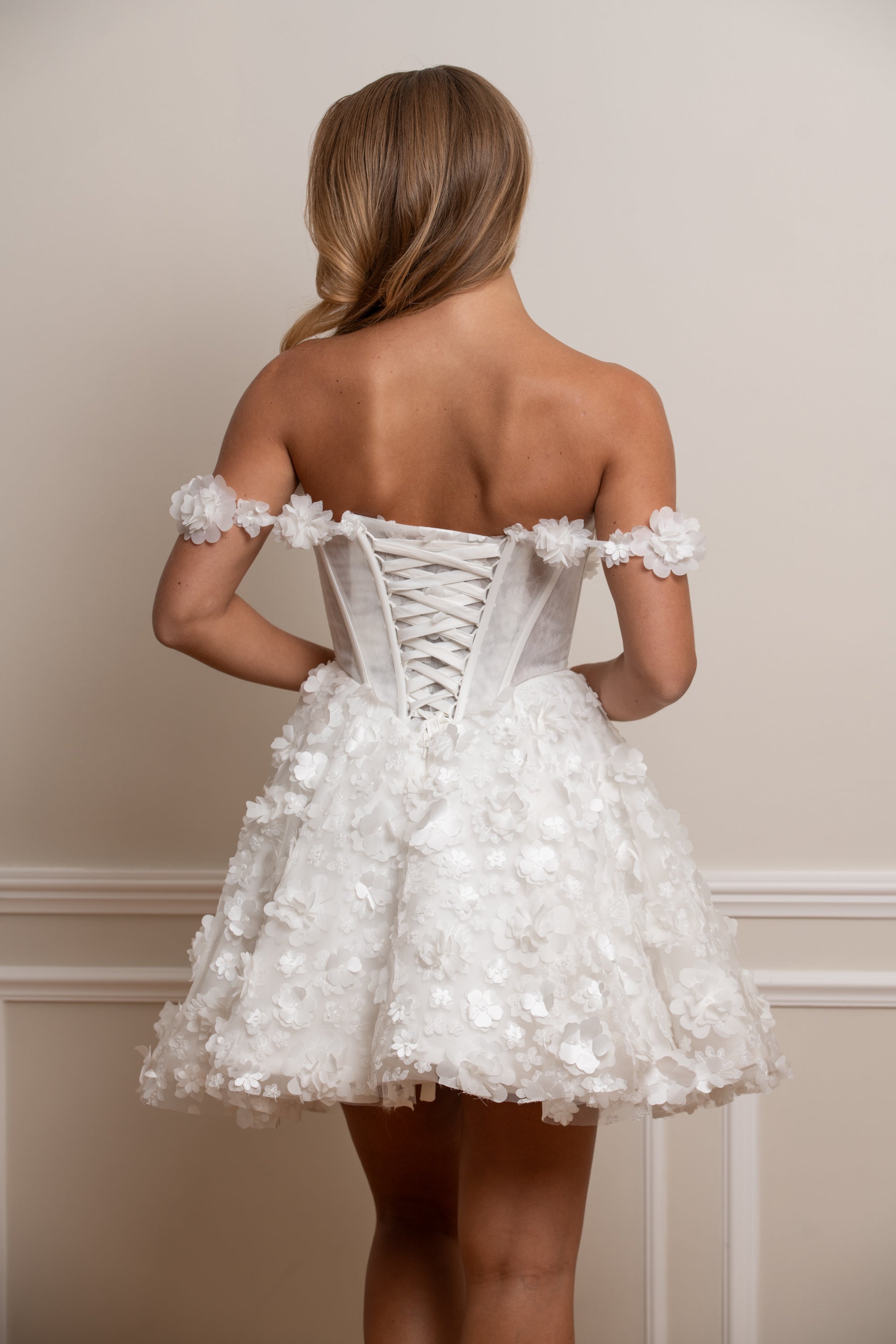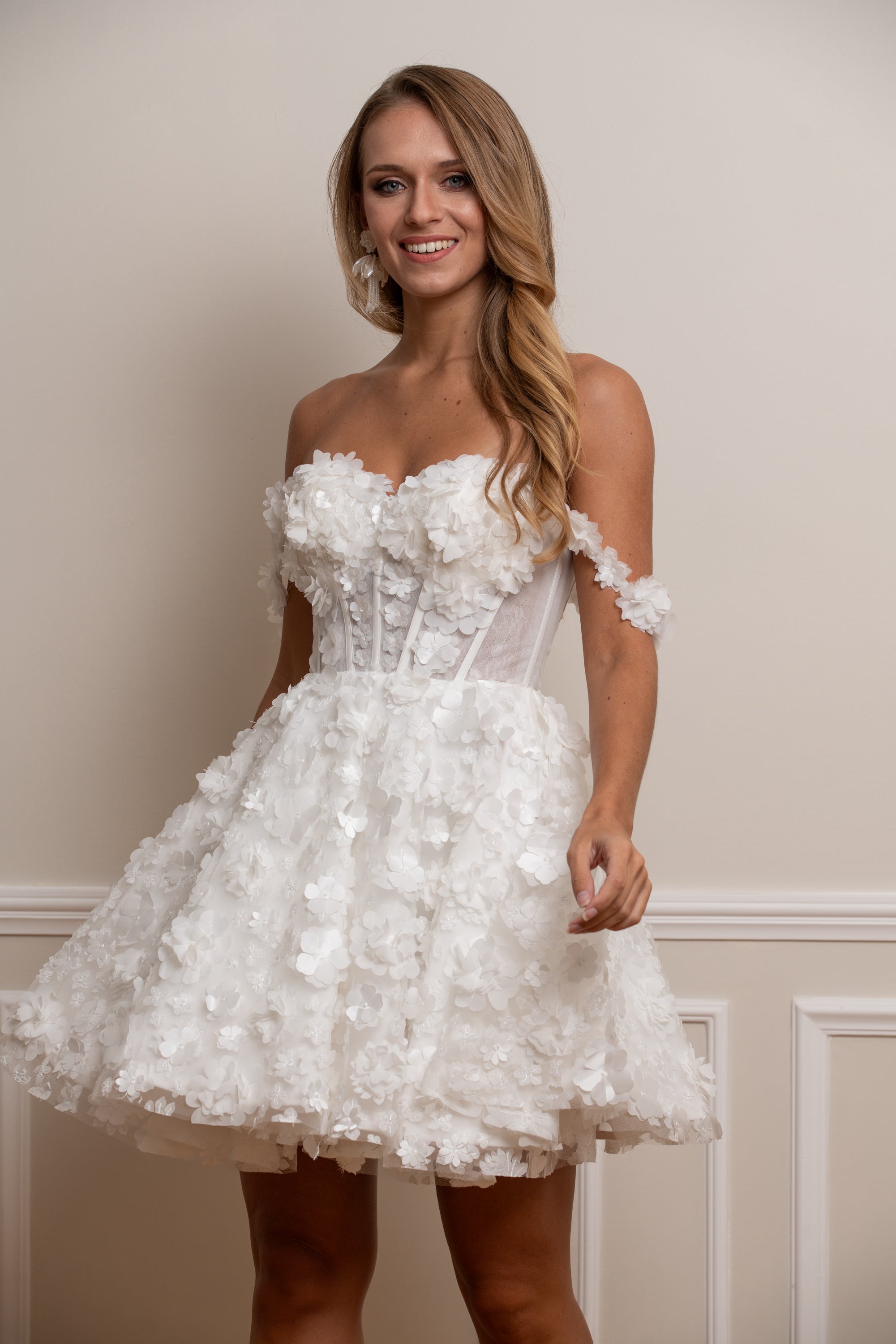 Sublimez votre mariage civil ou cérémonie intime avec cette robe de mariée courte en dentelle ivoire. Son corset structuré au laçage délicat met en valeur la silhouette, tandis que sa jupe évasée recouverte de fleurs en relief 3D apporte volume et légèreté.