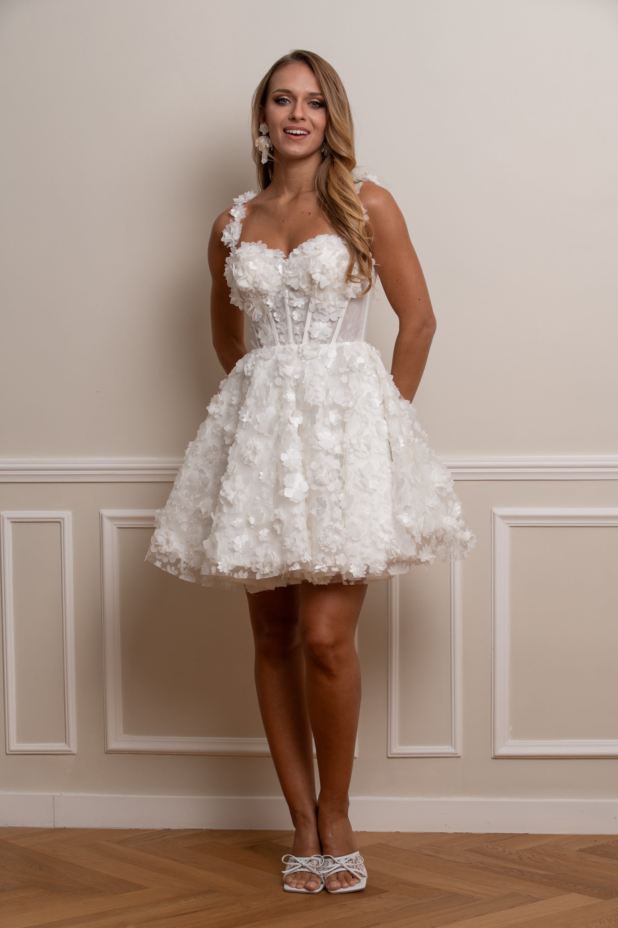 Idéale pour un mariage civil, un cocktail ou une cérémonie estivale, elle séduira les futures mariées en quête d’une création courte, florale et contemporaine.