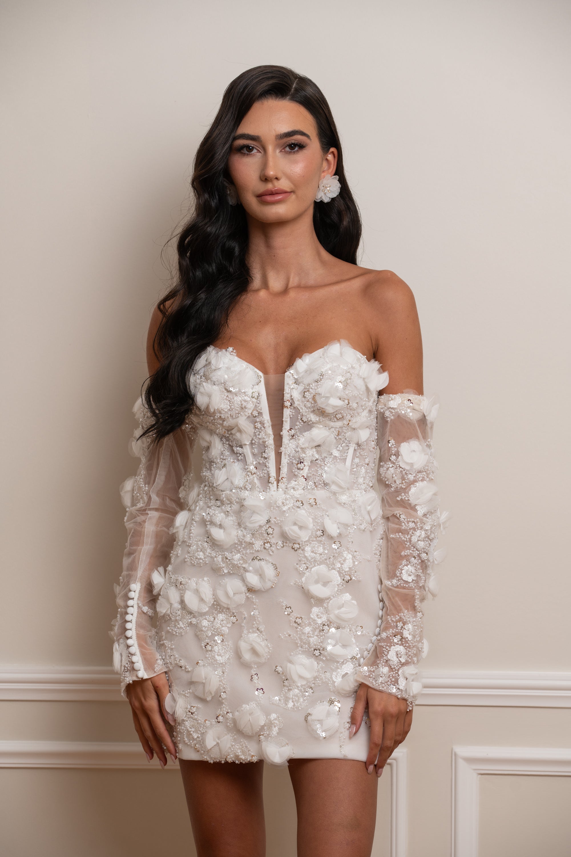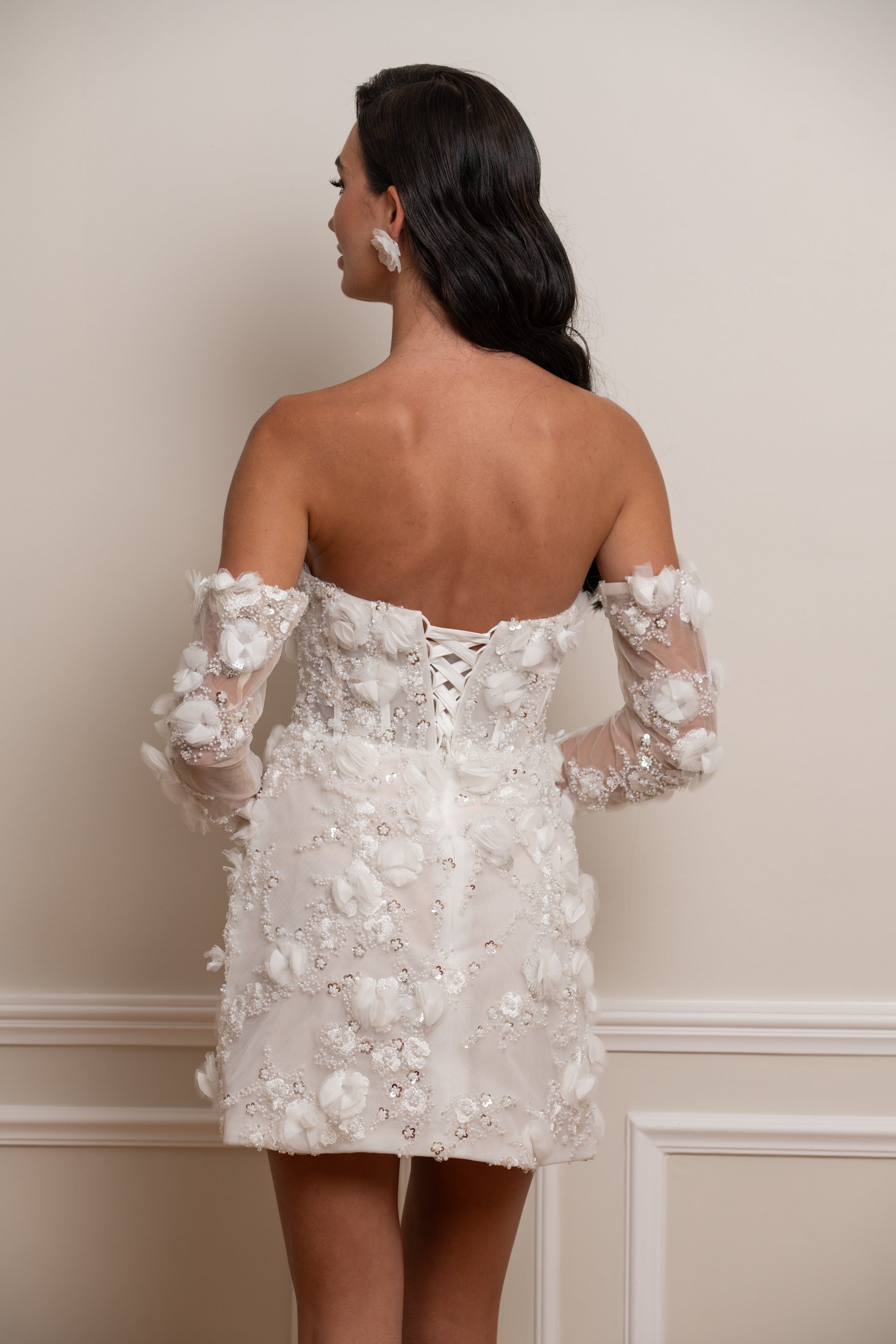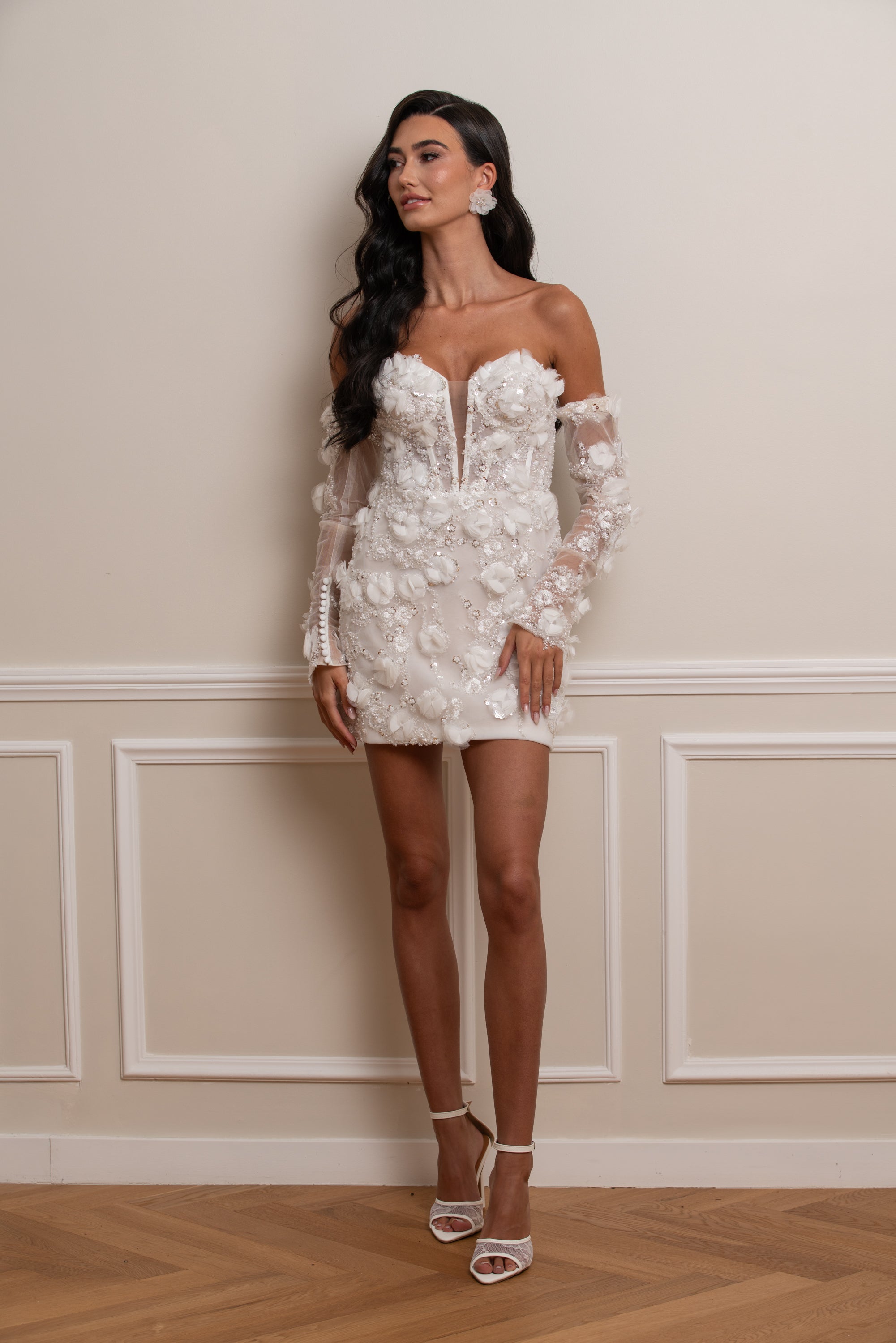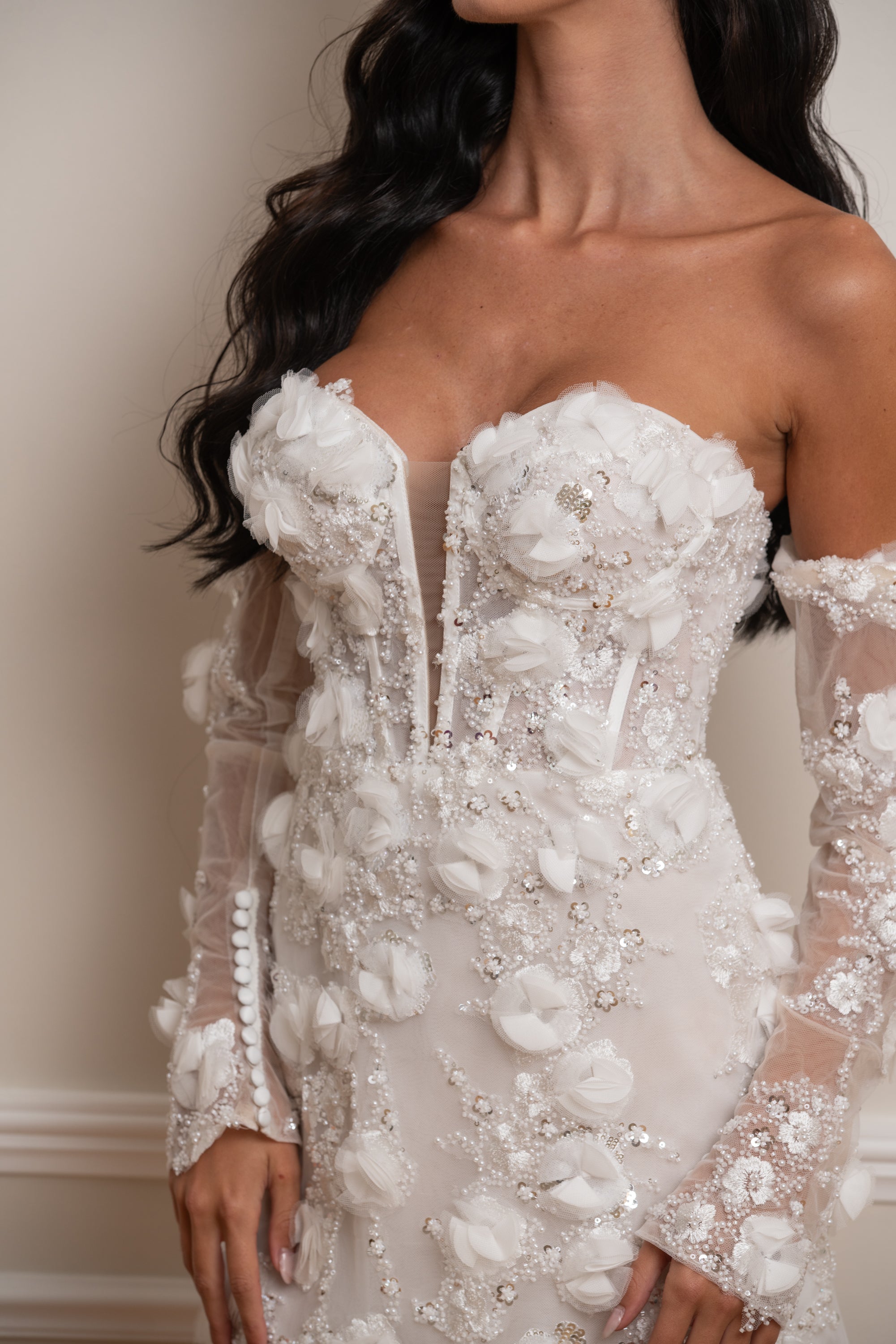 La robe est accompagnée de manches amovibles ornées des mêmes fleurs en relief que celles qui parsèment le bustier et la jupe. Elles permettent de transformer la silhouette selon les envies : romantique et sophistiquée avec les manches, ou moderne et épurée en version bustier.